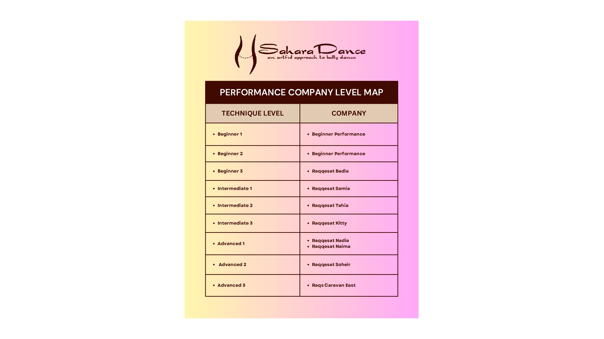 Still need advice or have questions? Sign up for a Technique Assessment where you can get review the curriculum choreographies of each level. Select two Sahara Dance curriculum teachers of your choice to offer feedback and placement recommendations on how to best level up your dance.